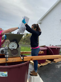 This is our "Pink Boots" wine. The women of the winery crushed and pressed 1.5 tons of Cabernet Franc on May 8, 2021. Michaela lead the team. Julia, Christy, Elisha, Anna, and Daria helped crush and press the grapes. It was a nice, cool day and a long day of physical work!
